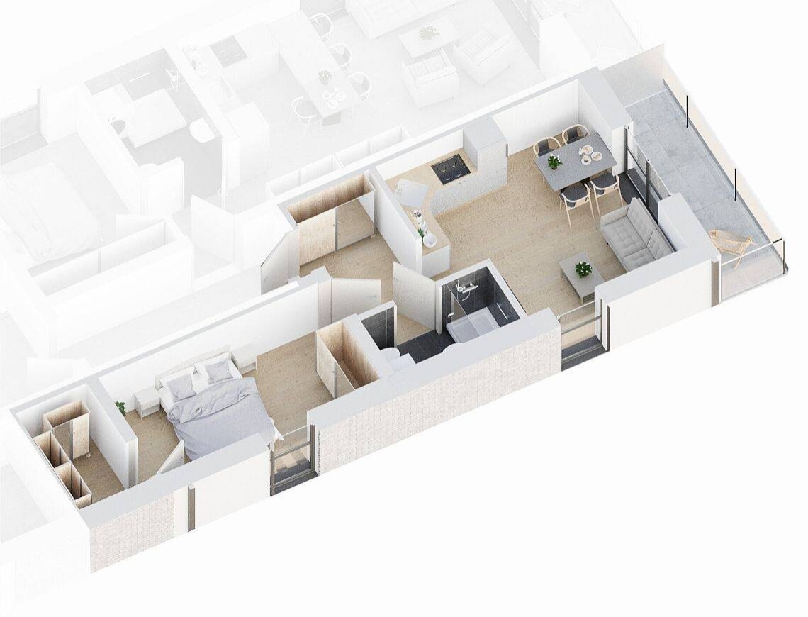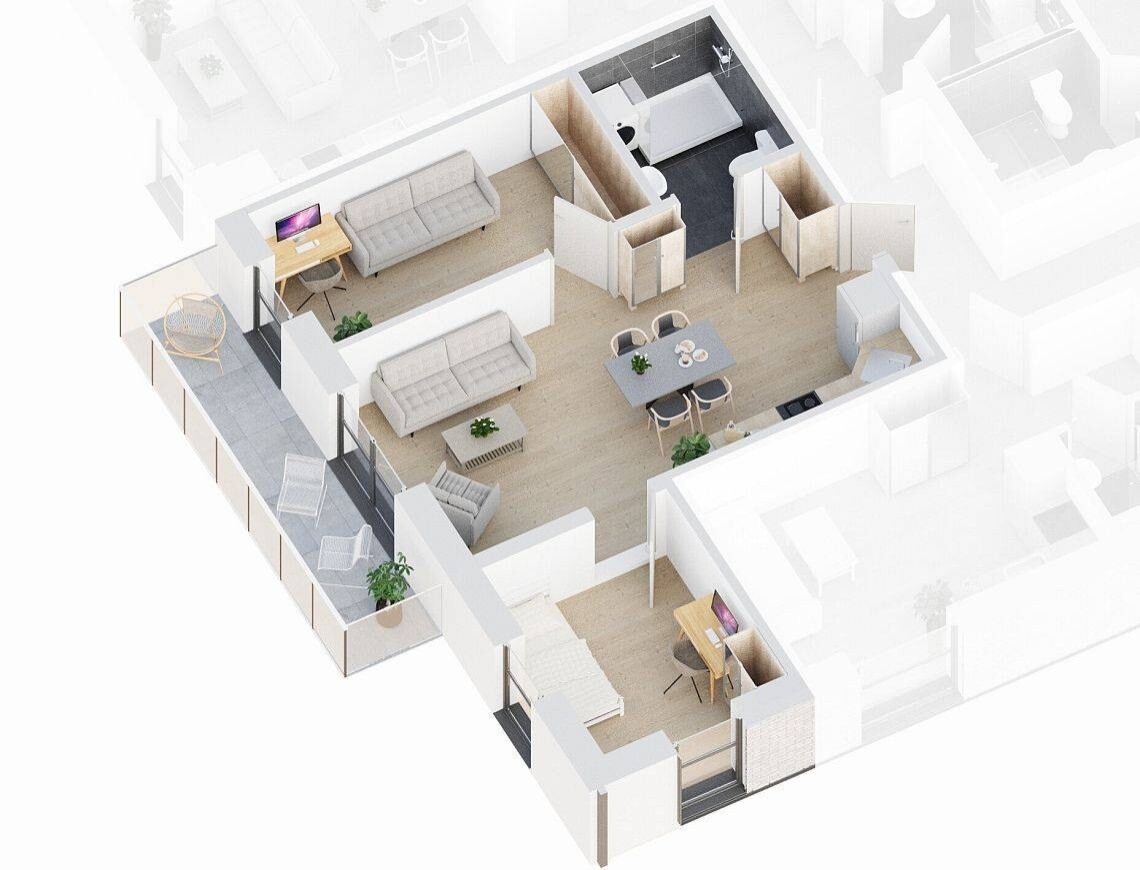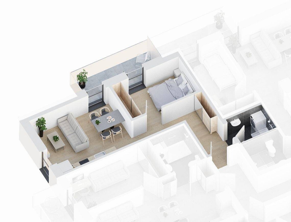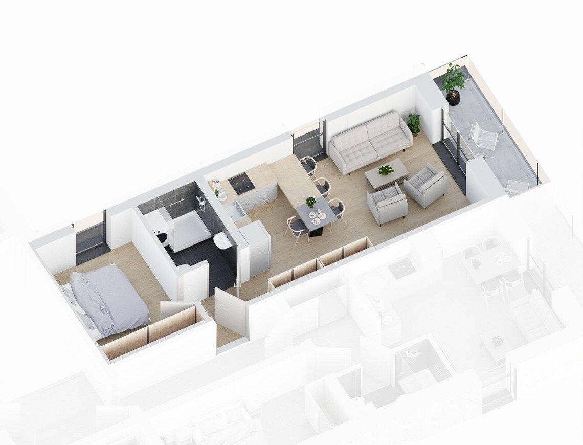 Skład: hol 3,55 m2, salon z aneksem kuchennym 21,39 m2, pokój 10,40 m2, drugi pokój 9,07 m2, łazienka 4,31 m2
